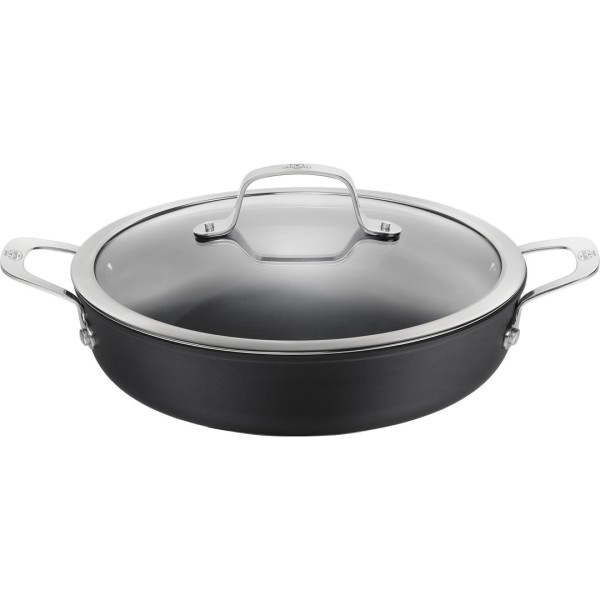 W skład zestawu wchodzi głęboka patelnia o średnicy 28 cm wyposażona w dwa ergonomiczne, stalowe uchwyty, które pozostają chłodne podczas gotowania. Produkt jest gotowy do natychmiastowego użycia.