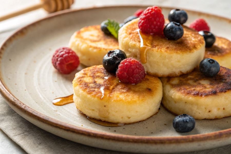 - Syrniki z owocami sezonowymi (podawaj z świeżymi malinami, borówkami lub truskawkami)