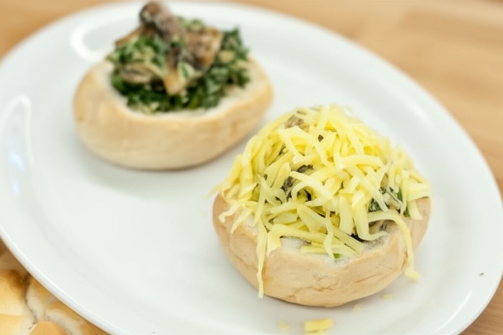 Kajzerki przekrój na połowę, wydrąż, zapiecz moment w piekarniku, a potem wypełnij szpinakiem. Posyp serem i zapiekaj w 190 °C przez 10 minut. Pieczarki możesz zamienić dowolnymi grzybami.