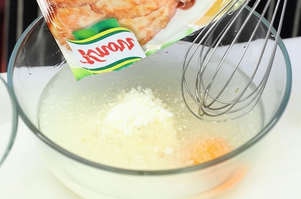 Wymieszaj Fix Knorr z wodą oraz jajkami, mieszaj aż powstanie jednolita masa.