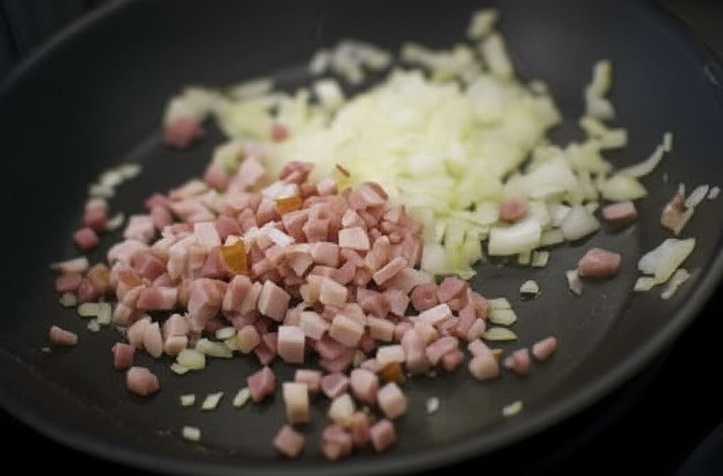 Cebulę oraz boczek pokrój w kostkę i zrumień na patelni.