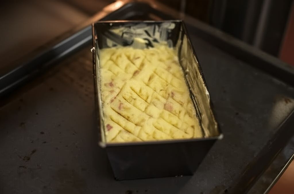 Schłodzoną cebulę i boczek wsyp do ciasta z ziemniaków, następnie całość umieść w foremce posmarowanej masłem.