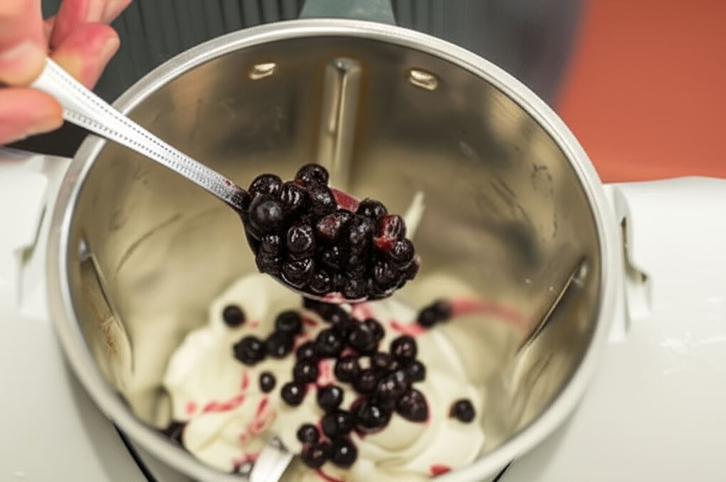 Zmiksuj w blenderze maślankę razem z jagodami.