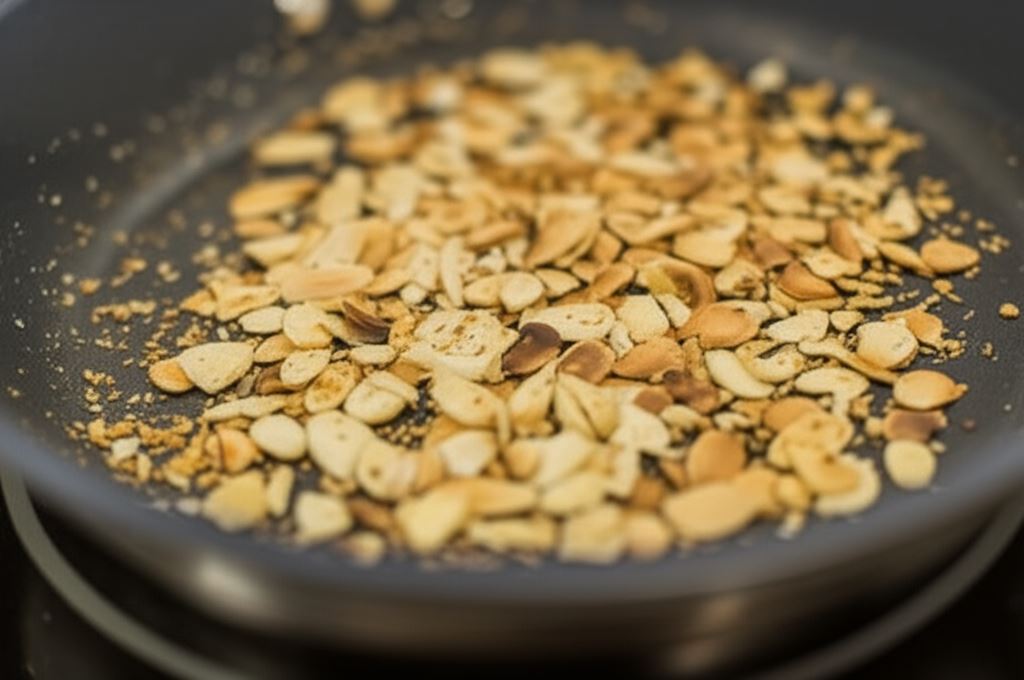 Migdałowe płatki zrumień na suchej patelni do złotego koloru.