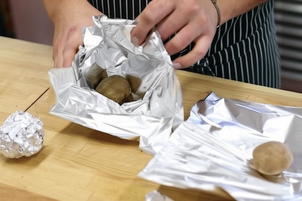 Ziemniaki starannie obmyj, wysusz, owiń każdy w folię aluminiową i zapiecz w piekarniku (180 °C, około 20 minut).