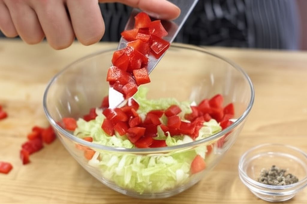 Przygotuj sałatkę: kapustę i paprykę umyj pod bieżącą wodą, potem pokrój (kapustę w paski, paprykę w małą kostkę). Dla smaku można dodać świeżo mielony pieprz kolorowy.