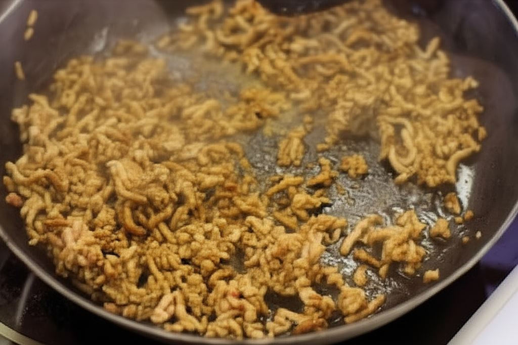 Wieprzowinę zmieszaj z łyżką sosu sojowego. Potem mięso przysmaż tak, aby uzyskać masę o grudkowatej strukturze. Wyjmij je i odcedź.