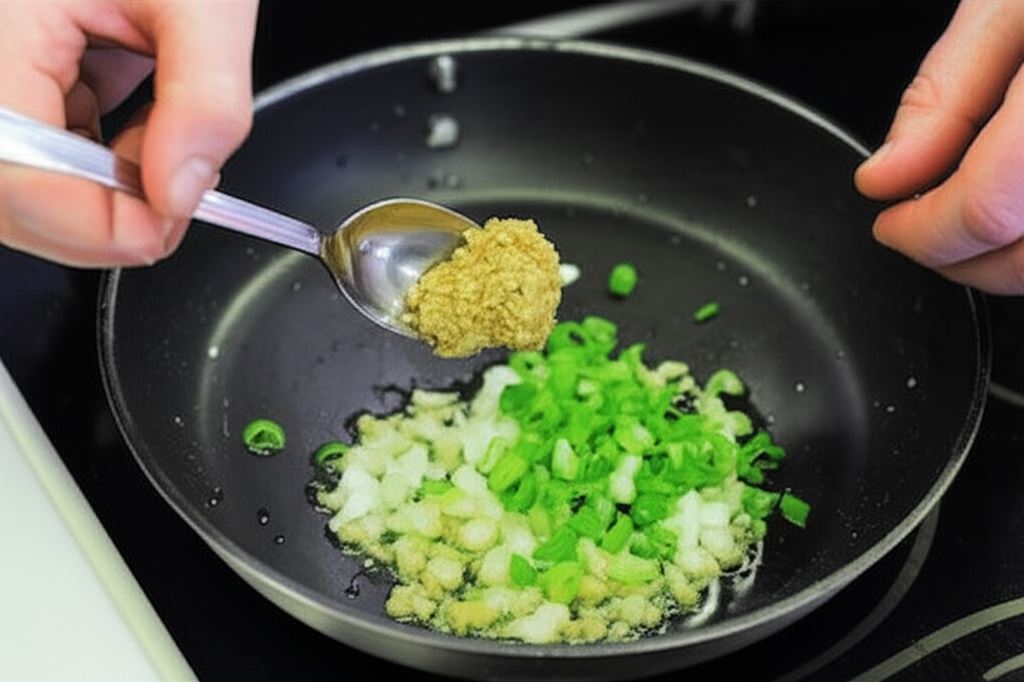 Na reszcie oleju smaż przez 30 sekund czosnek, imbir i cebulki dymki. Dodaj pastę z sezamu, pozostałą część sosu sojowego. Gotuj przez 4 minuty. Dołóż mięso.