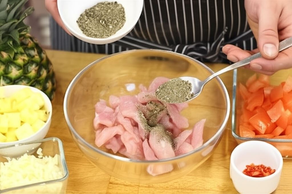 Mięso potnij na cienkie paski, posyp solą i pieprzem, następnie mięso włóż do lodówki na parę godzin. Posiekaj drobno młodą cebulkę, chili oraz kolendrę. Pomidory i ananasa pokrój w drobną kostkę.