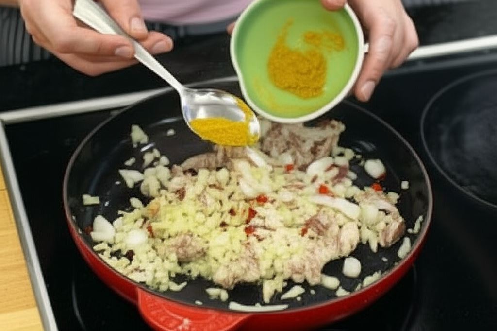 Na rozgrzanej oliwie na patelni podsmażaj indyka, wsyp cebulkę (jedynie białą część), curry i chili. Smaż wszystkie składniki moment aż zaczną przywierać do spodu patelni.