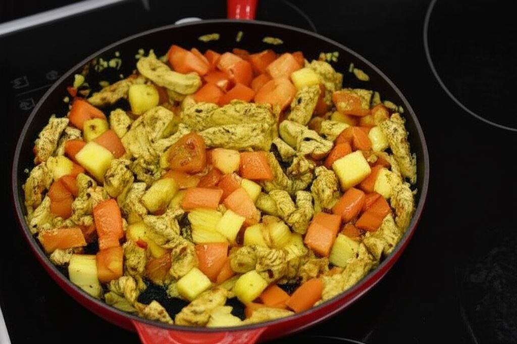Wrzuć następnie ananasa, pomidory, mleko kokosowe, wiórki. Całość gotuj przez około 20 minut, aż gulasz zgęstnieje redukując się o połowę.