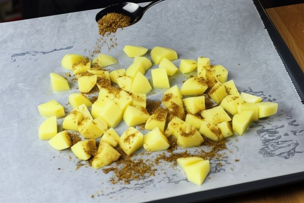 Ziemniaki obierz, pokrój w kostkę, połącz z dwoma łyżkami oliwy i przyprawą Knorr, a następnie zapiecz je w piekarniku w temperaturze 160*C przez 20 min.