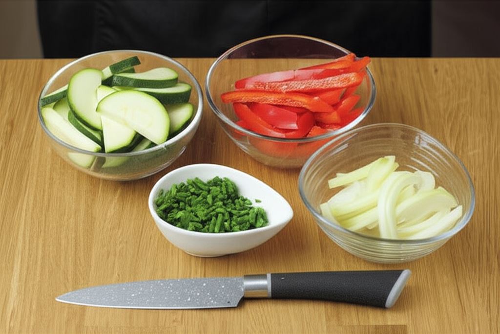 Cukinię pokrój na półplastry, paprykę i cebulę w paski, posiekaj szczypior.