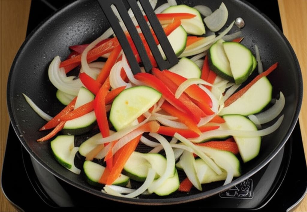 Wlej na patelnię resztę oliwy i zrumień na niej cukinię, cebulę oraz paprykę.