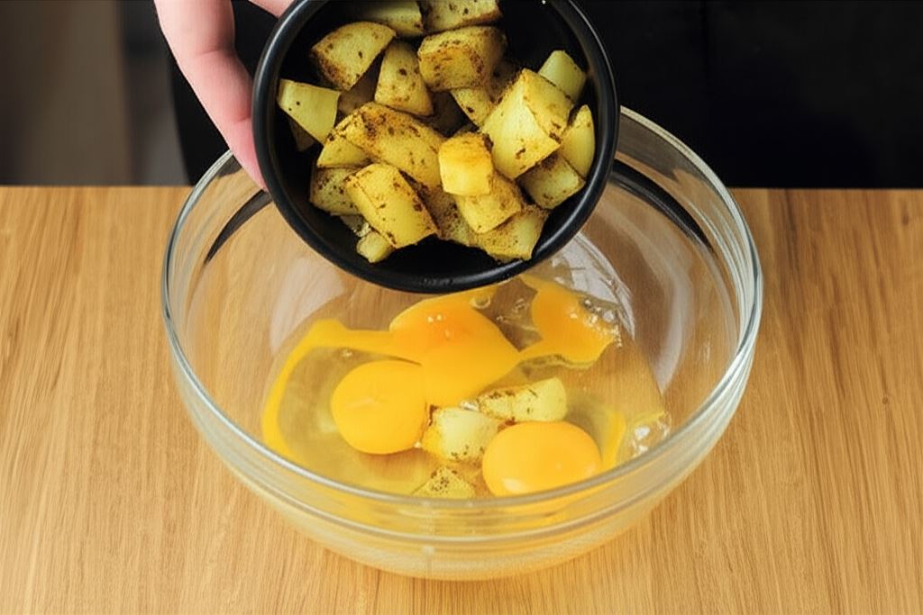 Rozbij jajka do miseczki, wsyp upieczone ziemniaki, przypraw solą i pieprzem i zamieszaj.