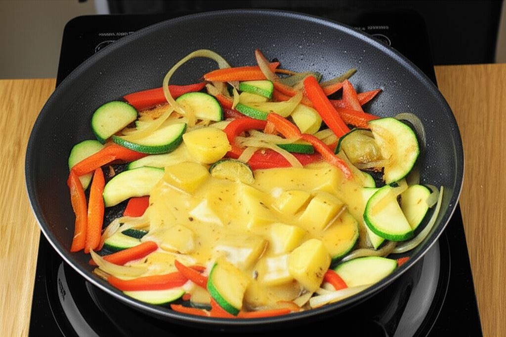 Wlej przygotowaną masę jajeczną na patelnię z warzywami i smaż na złoty kolor po obu stronach. Gotowy omlet udekoruj posiekanym szczypiorkiem.