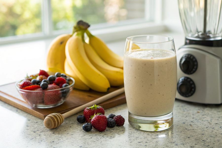 Smoothie energetyczne powstaje przez wzbogacenie bazy bananowej o kakao, odrobinę kawy lub guaranę. Dodanie łyżeczki masła orzechowego nie tylko podnosi kaloryczność, ale również zapewnia długotrwałe uwalnianie energii dzięki zawartości zdrowych tłuszczów.