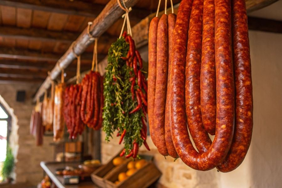 Tradycyjny proces produkcji chorizo to prawdziwa sztuka rzemieślnicza. Mięso wieprzowe (najczęściej z łopatki i podgardla) jest grubo siekane, a następnie mieszane z papryką pimentón, czosnkiem, solą oraz regionalnymi przyprawami. Po napełnieniu naturalnych osłonek kiełbasy poddawane są procesowi fermentacji i dojrzewania, który może trwać od kilku tygodni do nawet roku. W tym czasie rozwijają się charakterystyczne aromaty, a kiełbasa nabiera intensywnego smaku i trwałości.