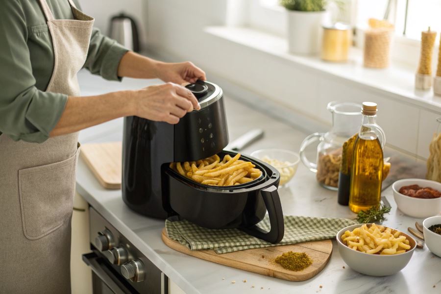 Frytkownice beztłuszczowe (powietrzne) wykorzystują technologię gorącego powietrza, redukując ilość tłuszczu nawet o 90%. To idealne rozwiązanie dla osób dbających o zdrowie, choć smak różni się nieco od tradycyjnych frytek.