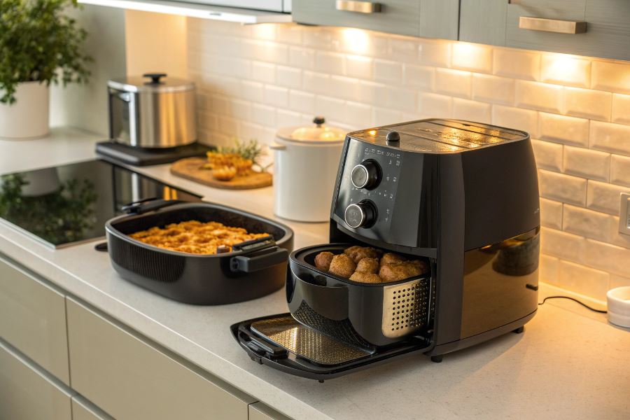 - Dla 3-4 osób: airfryer o pojemności 4-5 litrów lub multicooker 5-6 litrów