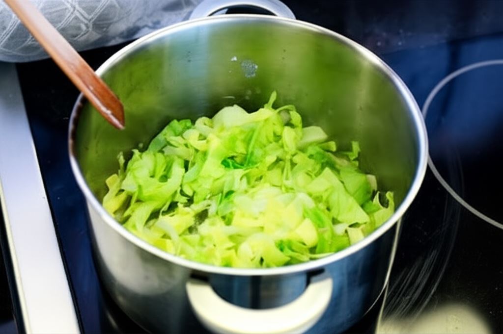 W garnku o grubym dnie rozpuść masło na średnim ogniu. Smaż w nim sałatę przez około 3 minuty. Trzeba uważać, by masło się nie przypaliło, bo potrawa stanie się niesmaczna i szkodliwa dla zdrowia. Dodaj bulion i doprowadź do wrzenia. Wsyp bób i 2/3 fasolki. Doprowadź całość do wrzenia i gotuj dalej przez około 20 minut.