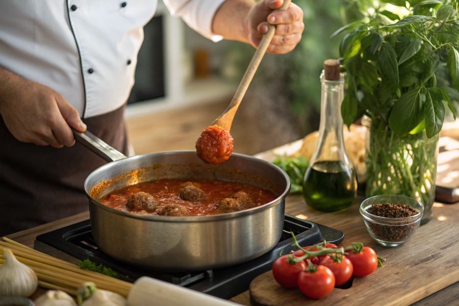 Dla najlepszego przeniknięcia smaków warto gotować pulpety bezpośrednio w sosie przez minimum 20 minut na małym ogniu pod przykryciem. Alternatywnie, upiecz pulpety w piekarniku (180°C, 15 minut), a następnie przełóż je do gotowego sosu i duś razem przez 10 minut. Ta technika pozwala mięsu wchłonąć aromaty, jednocześnie wzbogacając sos o smak pulpetów.