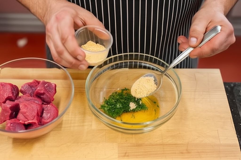 Mięso opłucz i osusz papierowym ręcznikiem. Potnij w grubą kostkę 3x3 cm. W miseczce połącz przyprawę Knorr, oliwę i połowę natki. Mięso włóż do marynaty.