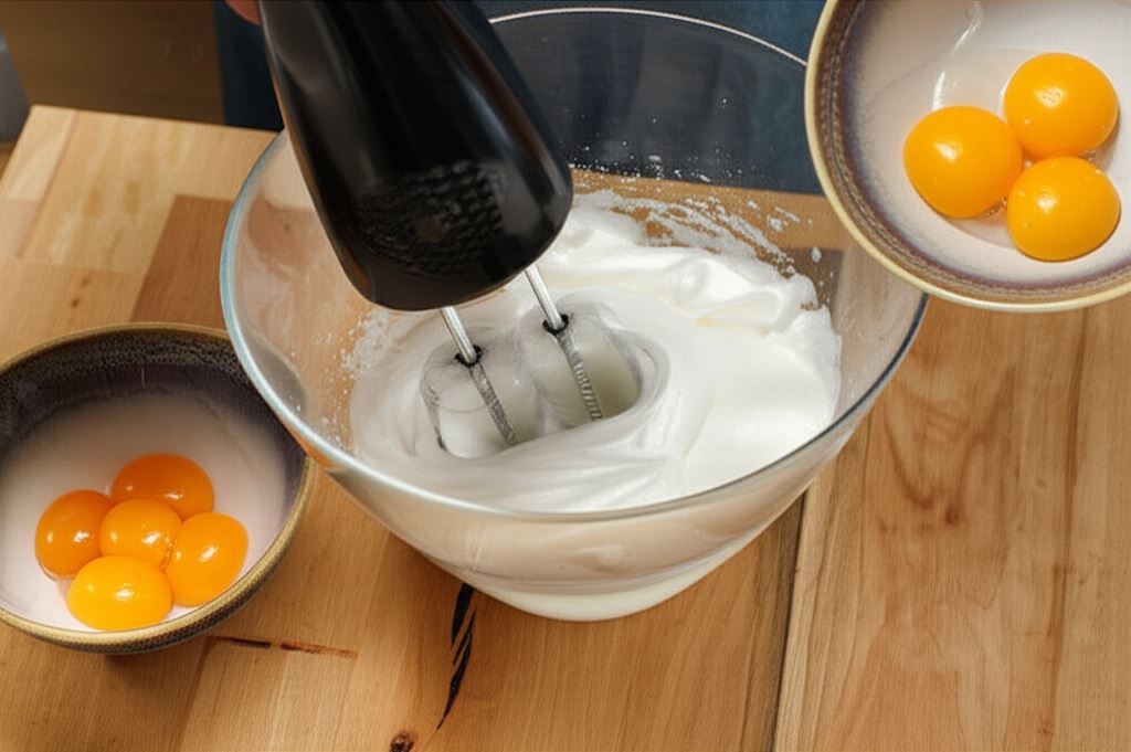 Oddziel białka od żółtek, ubij je na sztywną pianę. Podczas końcowej fazy ubijania stopniowo dodawaj cukier i po kolei żółtka, nie przerywając ubijania. Dodaj do masy jajowej obie mąki po przesianiu. Delikatnie połącz składniki za pomocą rózgi kuchennej.