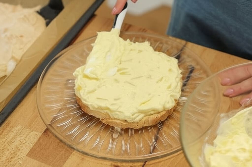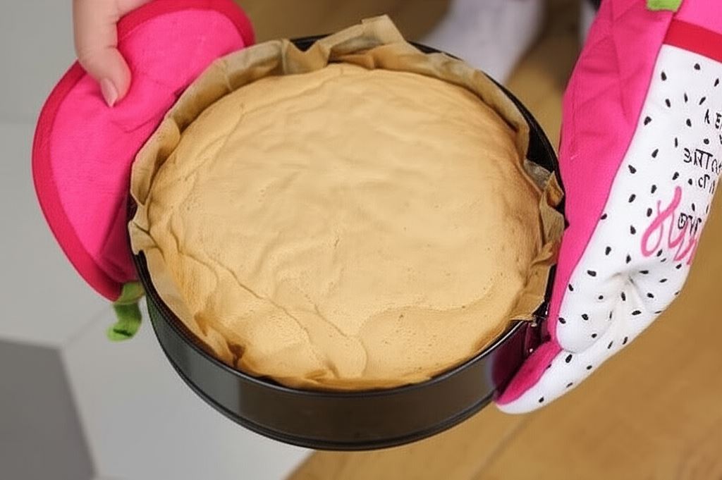 Do wyścielonej papierem do pieczenia formy tortowej przenieś ostrożnie ciasto i wypiekaj w temperaturze 160ºC przez około 40 minut. Gorące ciasto wyciągnij z piekarnika, z wysokości około 40 cm zrzuć je (w formie) na podłogę (ten zabieg sprawi, że biszkopt nie opadnie) i zostaw do ostygnięcia.
