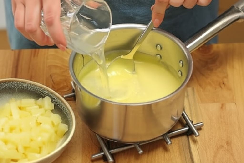 Płyn ponownie wlej do garnka, w którym gotowałeś czekoladę ze śmietaną, dodaj szklankę soku ananasowego. Całość postaw na ogniu i ogrzewaj, by mieszanka zgęstniała. Gotową masę przenieś do miski i odstaw do ostygnięcia.