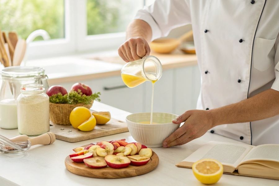 Sok z cytryny to najprostszy i najbardziej dostępny sposób na zachowanie jasnego koloru jabłek. Kwas cytrynowy skutecznie hamuje działanie enzymów odpowiedzialnych za brązowienie. Wystarczy skropić pokrojone jabłka sokiem z połowy cytryny i delikatnie wymieszać, aby równomiernie rozprowadzić sok.