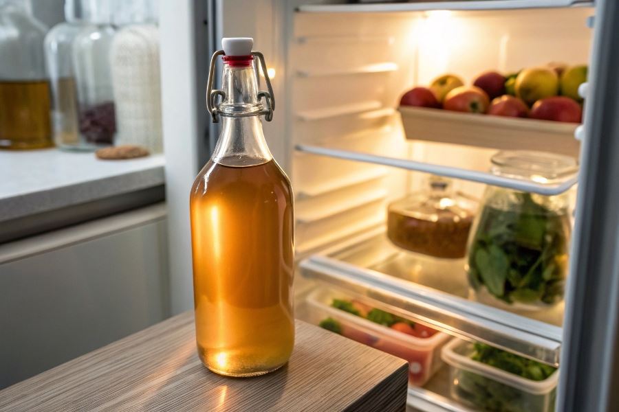 Ocet jabłkowy nie wymaga przechowywania w lodówce, nawet po otwarciu. Naturalne właściwości konserwujące kwasu octowego skutecznie hamują rozwój drobnoustrojów. Przechowywanie w temperaturze pokojowej jest w pełni wystarczające, a nawet zalecane – zbyt niska temperatura może powodować krystalizację i osadzanie się naturalnych osadów.