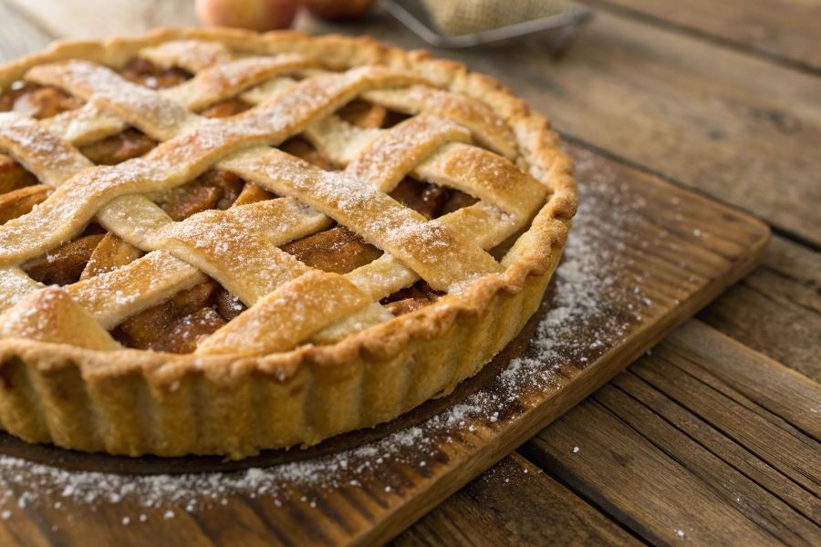 Szarlotka z kruszonką – dodatkowa warstwa słodkiej, maślanej kruszonki tworzy chrupiącą teksturę kontrastującą z miękkimi jabłkami.