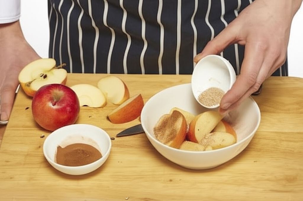 Nagrzej piekarnik do 180 °C. Natrzyj Przyprawę do kurczaka Knorr na udka z gęsi. Oprósz majerankiem. Włóż udka z gęsi do dużego naczynia do pieczenia i piecz przez 30 min. W międzyczasie pokrój jabłka na ćwiartki i wydrąż gniazda nasienne. Obtocz jabłka w cynamonie i gałce muszkatołowej.