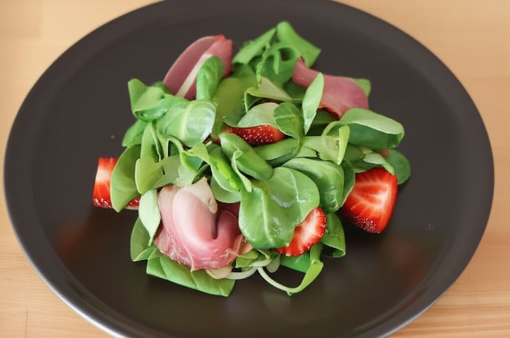 Suszona szynka parmeńska lub schwarzwaldzka nadaje sałatce wyrazisty, lekko słony smak, który idealnie komponuje się ze słodyczą truskawek. Poza sezonem truskawkowym możesz z powodzeniem zastąpić je winogronami, zachowując równie interesujący profil smakowy.