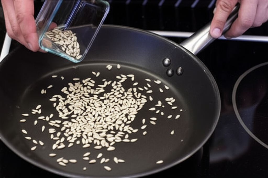 Nasiona słonecznika podpraż na suchej, nagrzanej patelni. Kiedy ostygną, posyp nimi sałatkę. Serwuj ją z grillowaną bagietką lub grissini.