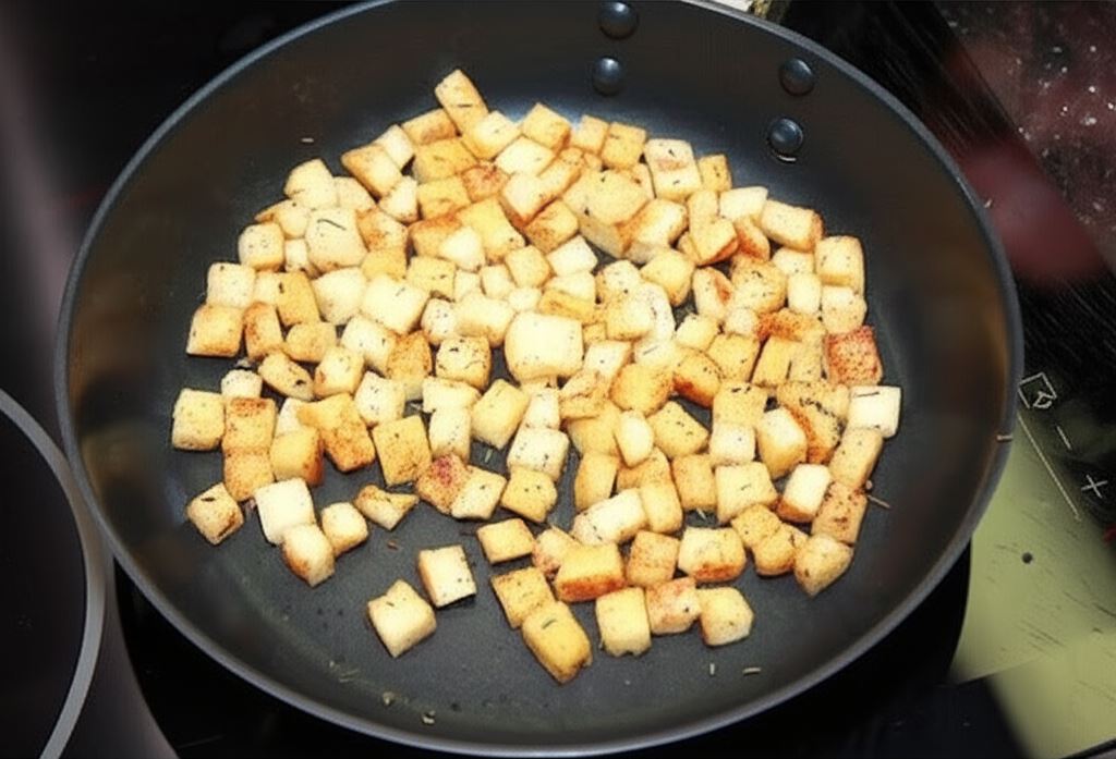 Usuń skórkę z chleba tostowego i pokrój go w kostkę o boku 1 centymetr. Podgrzej olej, zgnieć i dodaj ząbek czosnku oraz kawałki chleba. Delikatnie posól i smaż przez około 5 minut.