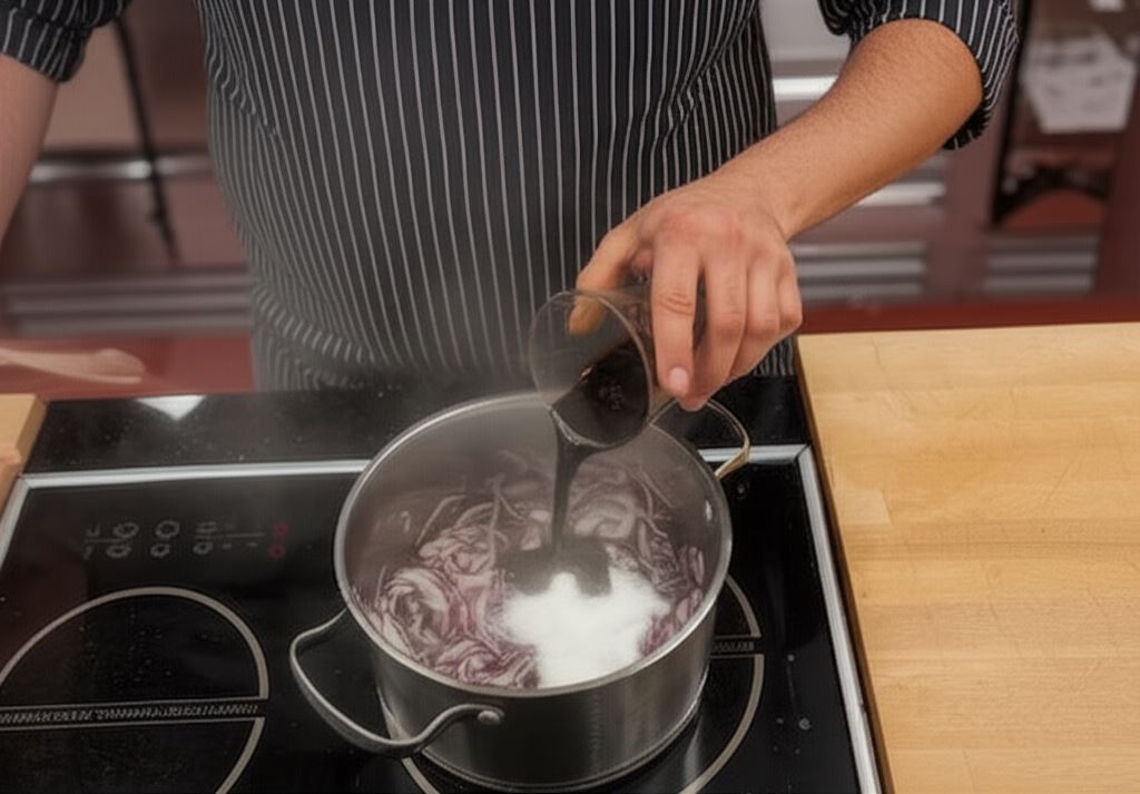 Cebule posiekaj w piórka, zrumień w garnku na rozgrzanym oliwie, wsyp cukier i wlej ocet balsamiczny. Gotuj na małym ogniu przez 30 minut, dolewając niewielką ilością wody co jakiś czas.