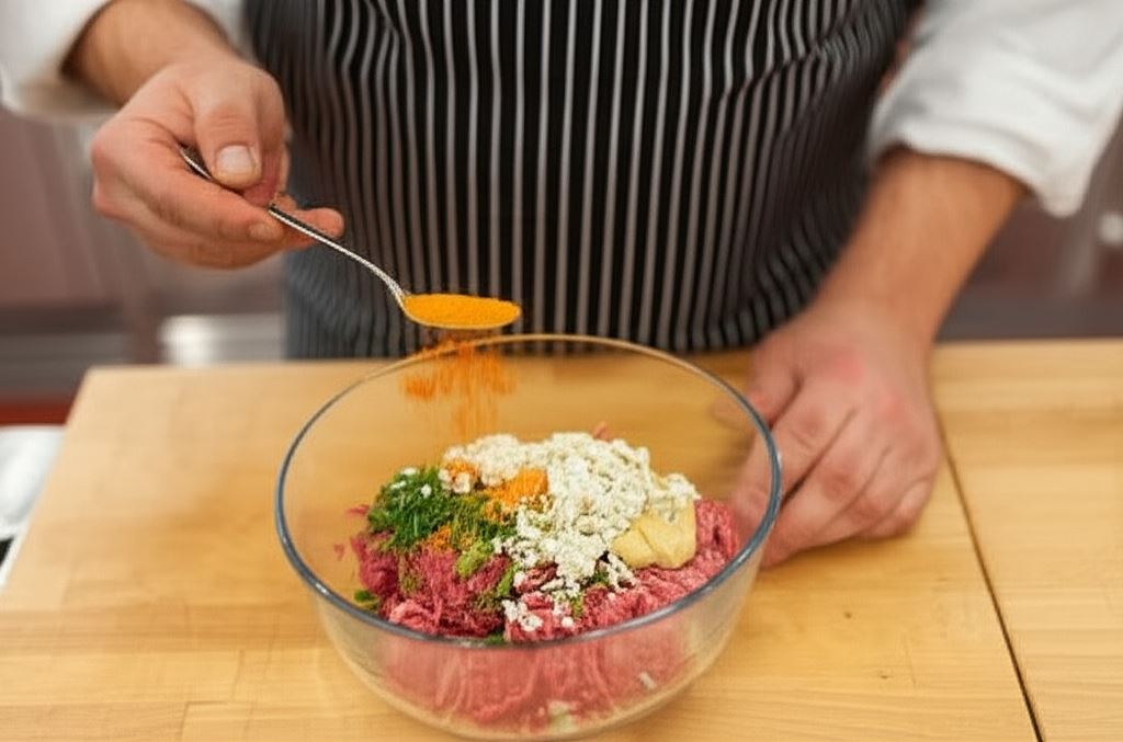 Mięso oczyść z błonek, potem zmiel w maszynce. Dodaj do mięsa przystawę Knorr, posiekaną natkę, musztardę, pieprz oraz pokruszony ser. Wymieszaj na jednolitą masę i uformuj 8 płaskich burgerów.