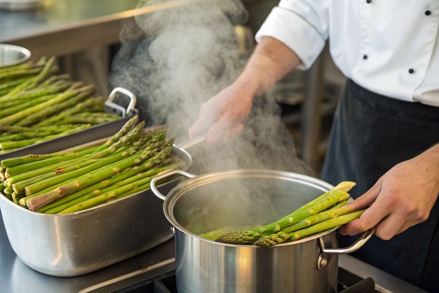 Szparagi zawsze wrzucamy do wrzącej wody – nigdy do zimnej. Ta technika ma kluczowe znaczenie: