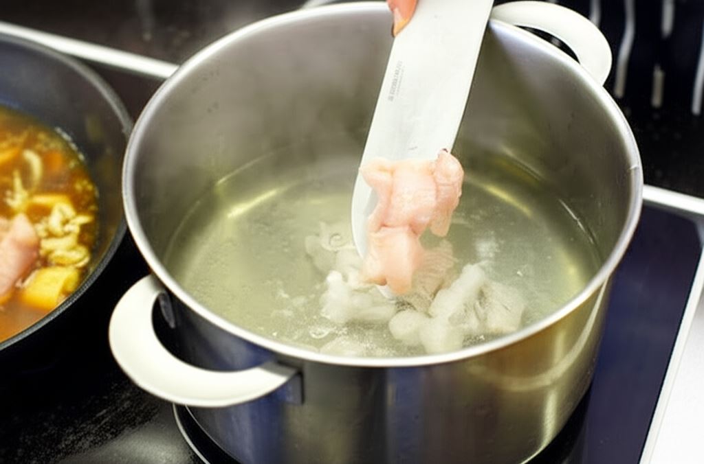 Mięso przepłucz, potnij w kostkę, umieść w garnku, zalej 1,2 l wody i gotuj przez 10 minut.