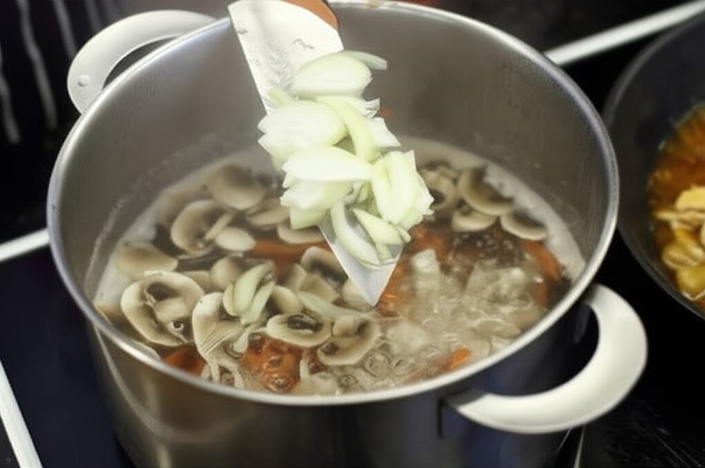 Grzyby, cebulę i marchewkę pokrój w paski, następnie wrzuć do wywaru razem z mięsem.