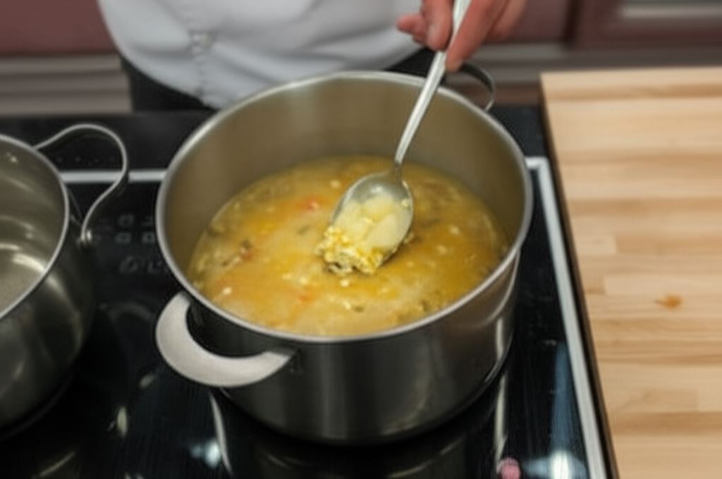 Dodaj do garnka odcedzoną kukurydzę i odcedzonego ananasa w kostkach z puszki. Gotuj zupę z warzywami przez następne 5 minut.