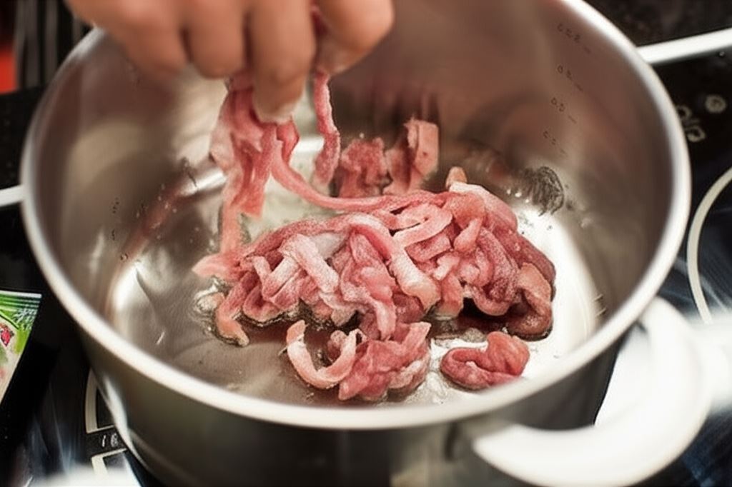 Oczyszczone mięso potnij w paski, posyp mąką i przyrumień w garnku na złoto.