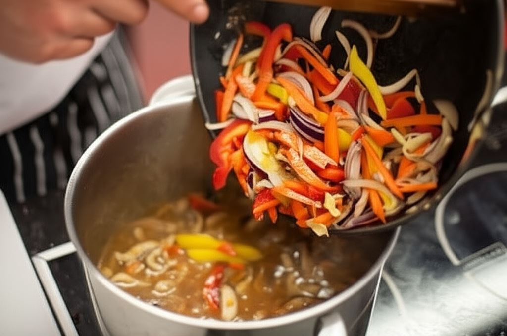 Kiedy mięso zmięknie, podsmaż na patelni na gorącym oleju warzywa, aż lekko się zrumienią, i dołóż do wieprzowiny.