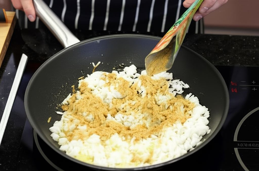Wsyp na patelnię ryż razem z zawartością opakowania Fix Knorr i mieszaj energicznie, by się nie przypaliło.