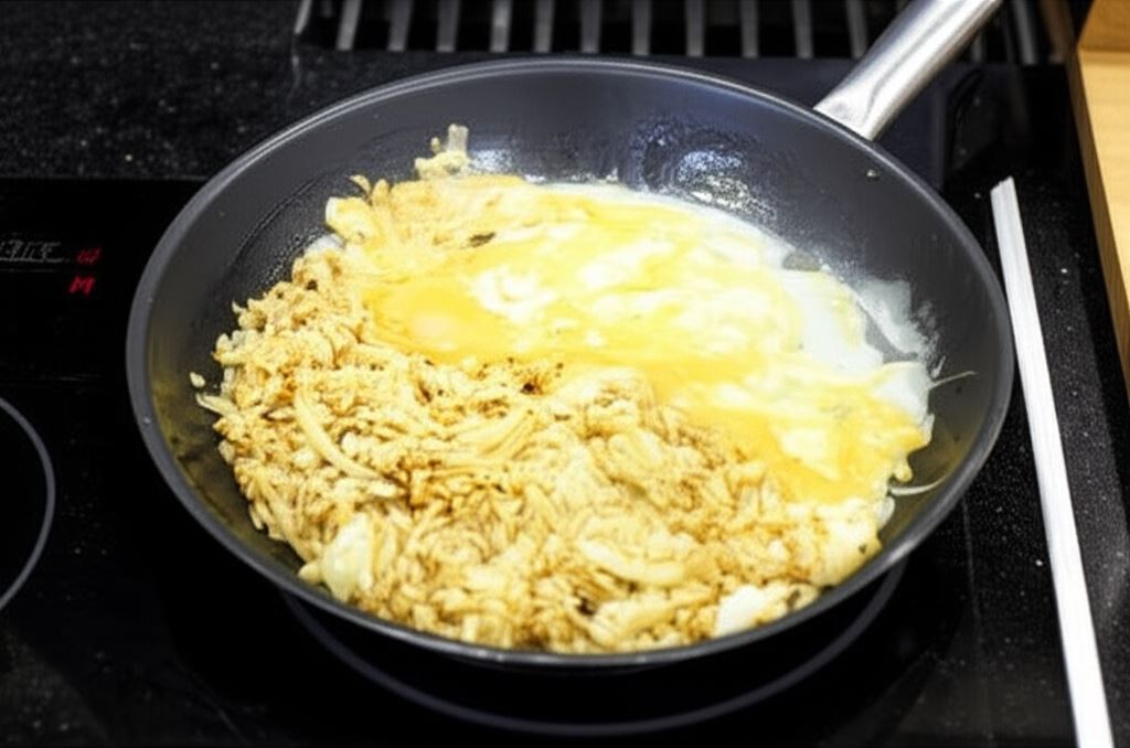 Ubij jajka i wlewaj stopniowo na patelnię, cały czas mieszając. Ryż serwuj oprószony kiełkami. W zbliżony sposób możesz także przyrządzić makaron.
