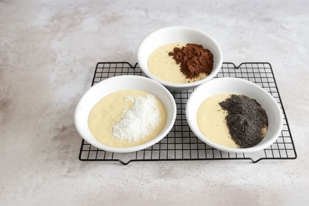 Rozdziel masę na trzy identyczne części. Do pierwszej wsyp kakao, do drugiej, wcześniej zmielony mak, a do trzeciej kokosowe wiórki. Zamieszaj.