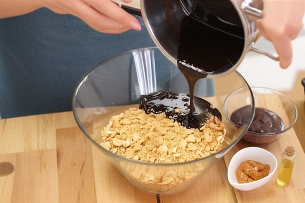 W garnku doprowadź do wrzenia mleko, cukier, połowę masła i kakao. Ostudź nieco i połącz z pokruszonymi herbatnikami, powidłami, masłem orzechowym oraz ekstraktem rumowym. Całość zagnieć aż uzyskasz jednolitą masę.