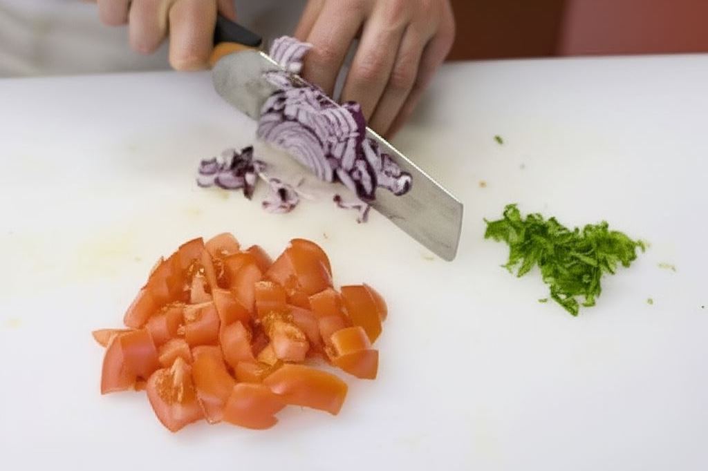 Opłucz pomidory, pokrój w kostkę. Opłucz zioła, potem posiekaj. Obierz cebulę i także posiekaj.